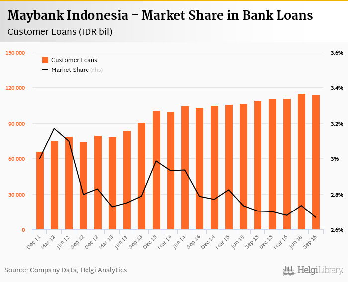 Maybank Indonesia's customer loans reached IDR 113,771 bil in 2016-09-30, down 1.17% compared to the previous year.