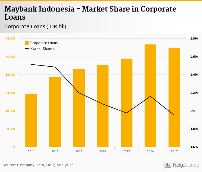Maybank Indonesia's corporate loans reached IDR 44,042 bil in 2017, down 3.03% compared to the previous year.