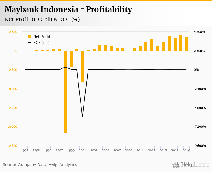 Maybank Indonesia made a net profit of IDR 1,839 bil in 2019, down 16.1% compared to the previous year. This implies a return on equity of 7.10%.