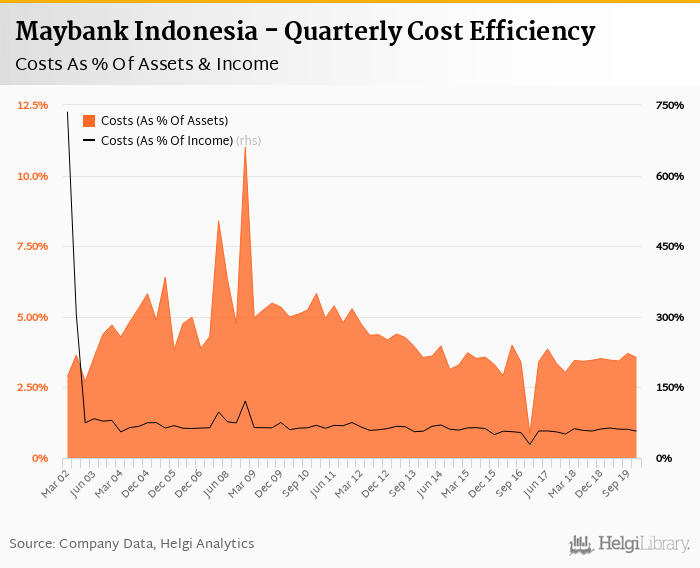 Historically, the bank’s costs reached an all time high of 736% of income in 1Q2002 and an all time low of 28.8% in 4Q2016.