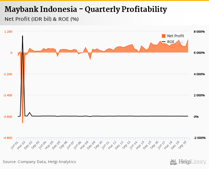 Historically, the bank’s net profit reached an all time high of IDR 732 bil in 4Q2019 and an all time low of IDR -3,993 bil in 4Q2001. The average profit in the last six quarters amounted to IDR 516 bil.