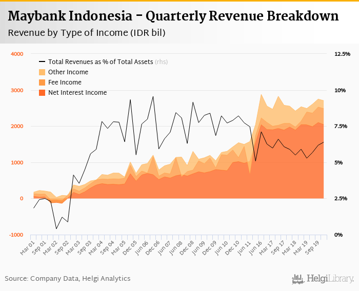Maybank Indonesia generated total banking revenues of IDR 2,705 bil in the fourth quarter of 2019, down 0% when compared to the same period of last year and 1.56% when compared to the previous quarter.