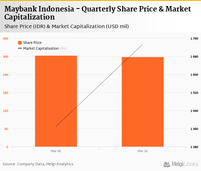Maybank Indonesia stock traded at IDR 298 per share at the end of first quarter of 2010 implying a market capitalization of USD 1,733 mil.