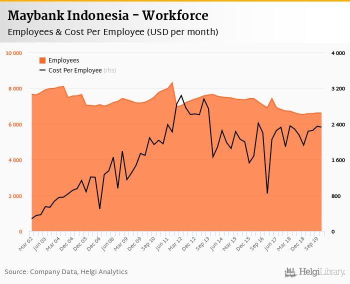 Maybank Indonesia employed 6,603 persons in 2019-12-31, down 0.166% when compared to the previous year. Historically, the bank's workforce hit an all time high of 8,296 persons in 2011-09-30 and an all time low of 6,529 in 2018-12-31.