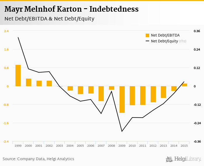 Mayr Melnhof Karton's net debt stood at EUR 32.9 mil and accounted for 0.029 of equity at the end of 2015. The ratio is up 0.078 pp compared to the previous year.