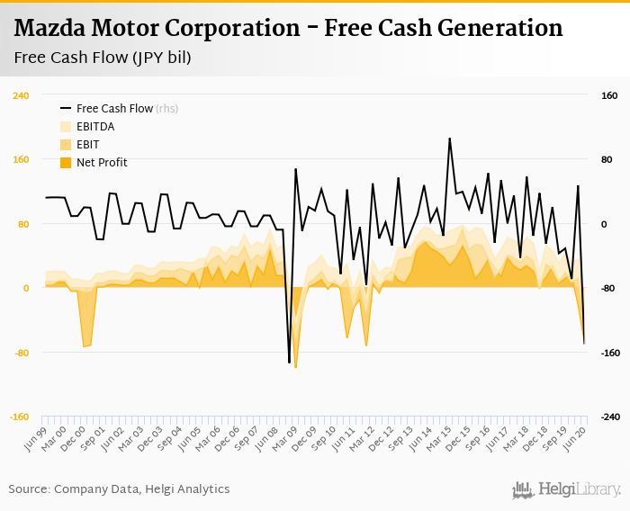 The company generated cash, defined by a sum of net profit and depreciation, of JPY -43.7 bil or -11.6% of sales. When investments are excluded, free cash flow reached JPY -151 bil, or -40.1% of sales in 2Q2020.