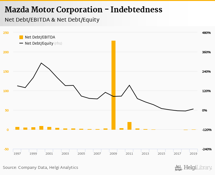 Mazda Motor Corporation's net debt stood at JPY 81.4 bil and accounted for 6.50% of equity at the end of 2019. The ratio is up 12.7 pp compared to the previous year.