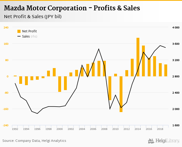 Mazda Motor Corporation made a net profit of JPY 58.8 bil in 2019, down 8.39% compared to the previous year. Total sales reached JPY 3,498 bil, which is down 1.42% when compared to the previous year.