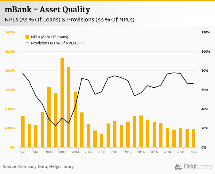 Comparing mBank with its closest peers, PKO BP operated at the end of 2022 with NPL ratio of 3.83% and provision coverage of 109%, Pekao with 6.03% and 102% respectively and ING Bank Slaski had 2.26% of bad loans covered with 92.7% by provisions at the end of 2022.