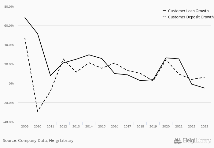 On the other hand, bank's customer deposit growth amounted to 6.08% at the end of 2023, up from 3.91% when compared to the previous year. Historically, the bank’s deposit growth reached an all time high of 47.1% in 2009 and an all time low of -29.2% in 2010. In the last decade, the average annual loan growth amounted to 12.4%.
