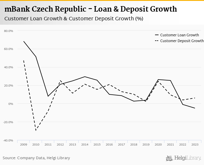 mBank Czech Republic's customer loan growth reached -5.10% in 2023, down from -1.03% compared to the previous year. Historically, the bank’s loans growth reached an all time high of 68.2% in 2009 and an all time low of -5.10% in 2023. In the last decade, the average annual loan growth amounted to 11.9%.