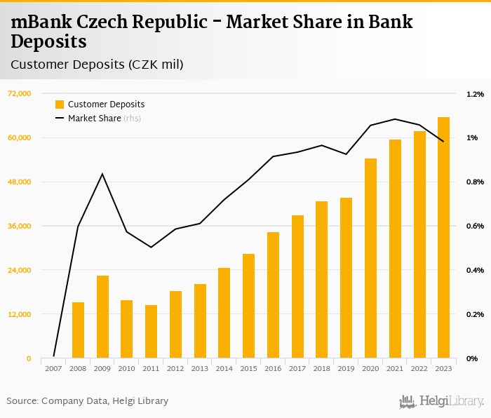 mBank Czech Republic's customer deposits reached CZK 65,665 mil in 2023, up 6.08% compared to the previous year.