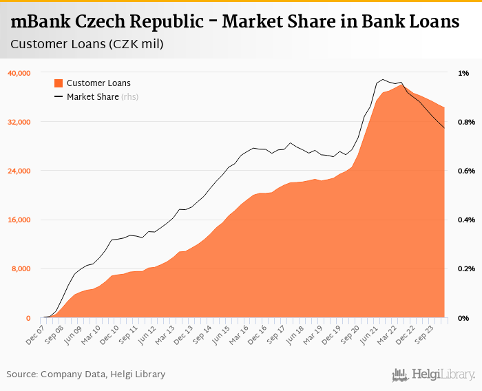mBank Czech Republic's customer loans reached CZK 34,203 mil in 2024-03-31, down 1.41% compared to the previous year.