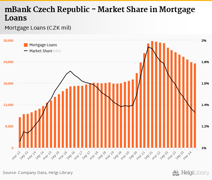 mBank Czech Republic's mortgage loans reached CZK 23,629 mil in 2Q2024, down 1.37% compared to the previous year.