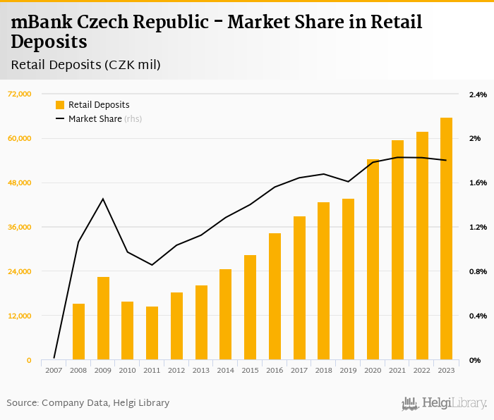 mBank Czech Republic's retail deposits reached CZK 65,665 mil in 2023, up 6.08% compared to the previous year.
