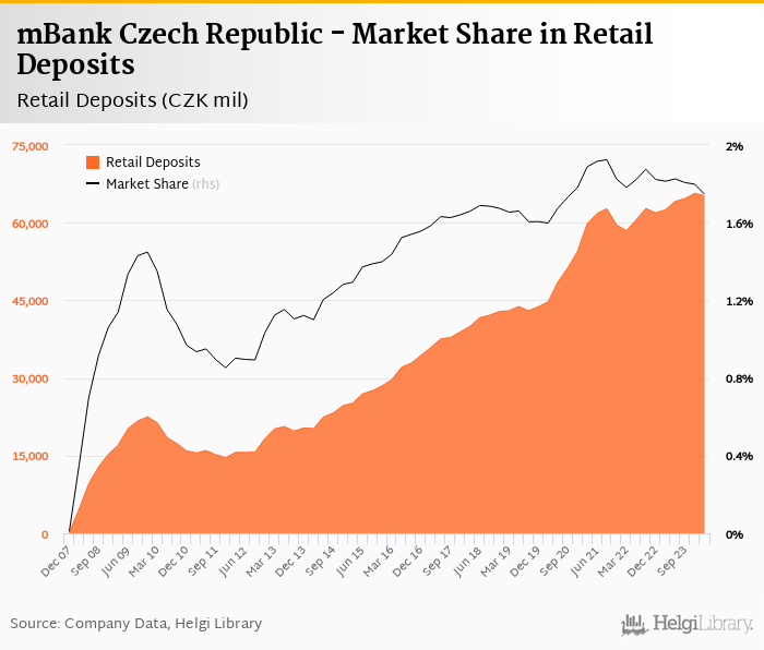 mBank Czech Republic's retail deposits reached CZK 65,191 mil in 2024-03-31, down 0.721% compared to the previous year.