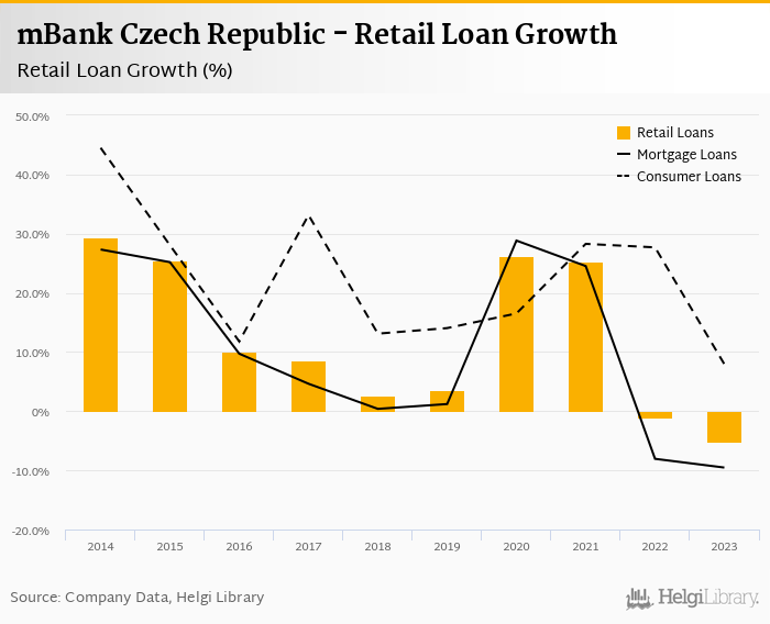 mBank Czech Republic's retail loans reached CZK 34,691 mil at the end of 2023, down 5.10% compared to the previous year. In the last decade, the average annual loan growth amounted to 0%.