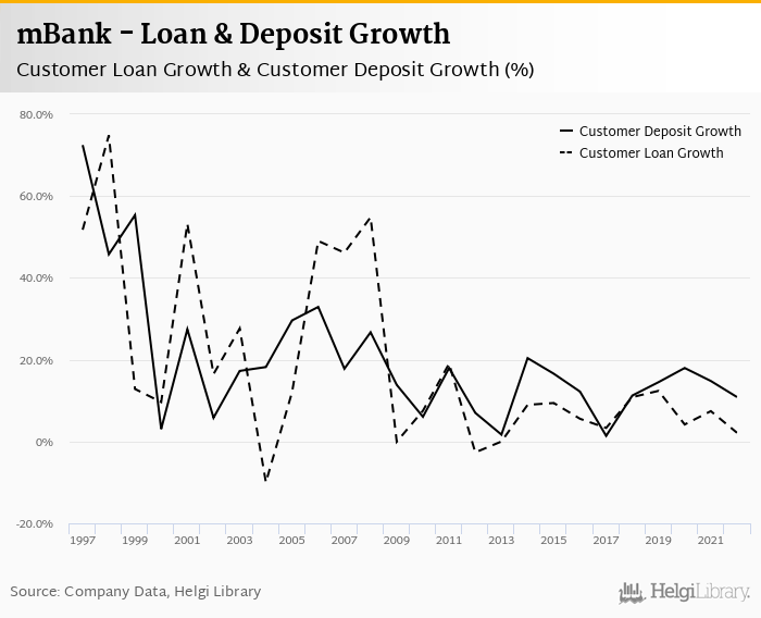 mBank's customer loan growth reached 2.13% in 2022, down from 7.43% compared to the previous year. Historically, the bank’s loans growth reached an all time high of 74.8% in 1998 and an all time low of -9.99% in 2004. In the last decade, the average annual loan growth amounted to 6.35%.