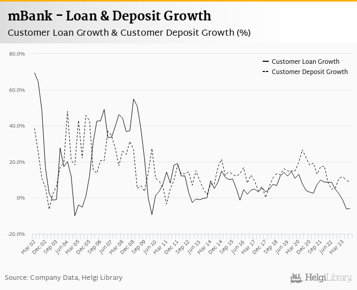 mBank's customer loan growth reached -5.97% in 2023-09-30, down from 4.70% compared to the previous year. Historically, the bank’s loans growth reached an all time high of 69.4% in 2002-03-31 and an all time low of -9.99% in 2004-12-31. In the last decade, the average annual loan growth amounted to 5.93%.