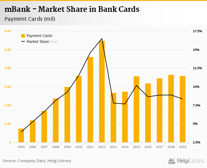 mBank therefore accounted for 8.35% of all bank cards issued by banks in Poland at the end of 2019. Historically, the bank’s market share in payment cards reached an all time high of 16.5% in 2012 and an all time low of 3.88% in 2005.