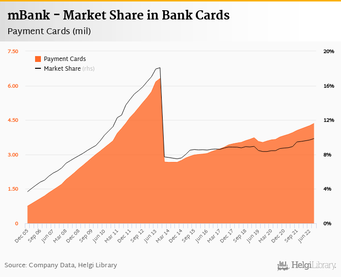 mBank therefore accounted for 9.85% of all bank cards issued by banks in Poland at the end of 2022-09-30. Historically, the bank’s market share in payment cards reached an all time high of 18.1% in 2013-09-30 and an all time low of 3.68% in 2005-12-31.
