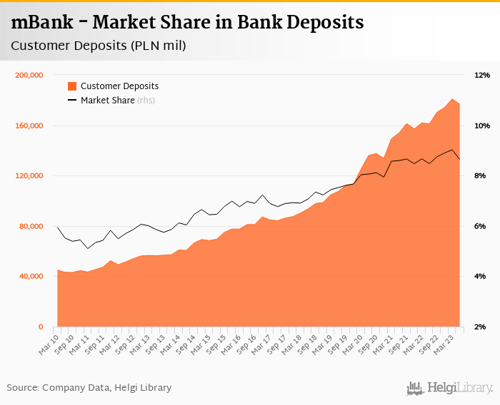 mBank accounted for 8.64% of all customer deposits taken by banks in Poland at the end of 2023-06-30. Historically, the bank’s market share in customer deposits reached an all time high of 9.02% in 2023-03-31 and an all time low of 5.10% in 2011-03-31.