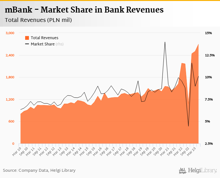 As a result, mBank accounted for 10.1% of all bank revenues generated by banks in Poland in 2023-06-30. Historically, the bank’s market share in total revenues reached an all time high of 14.0% in 2020-12-31 and an all time low of 4.45% in 2022-09-30.