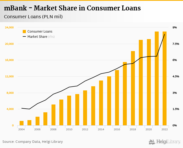 mBank accounted for 8.39% of all consumer loans issued in Poland at the end of 2022. Historically, the bank’s market share in consumer loans reached an all time high of 8.39% in 2022 and an all time low of 1.50% in 2005.