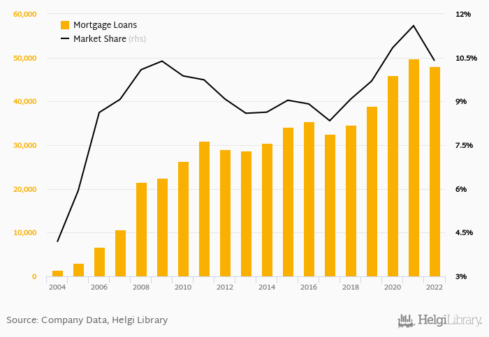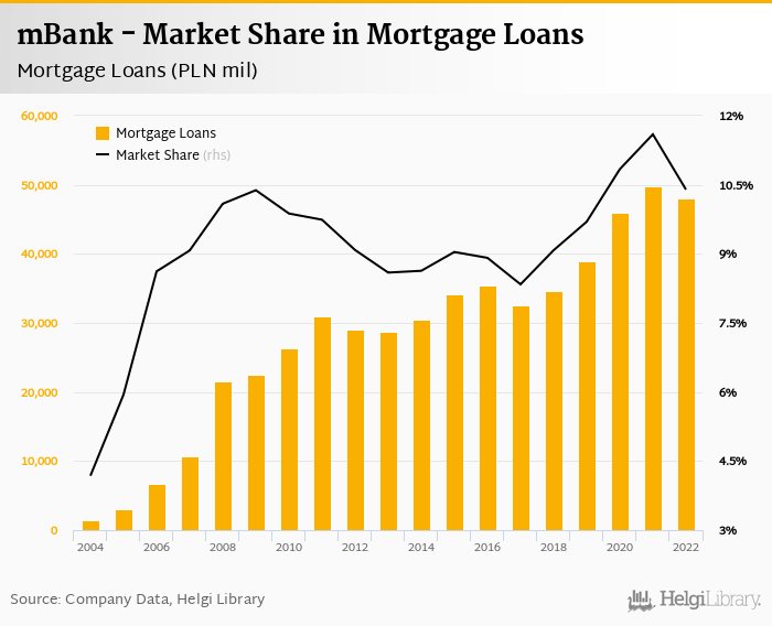 mBank accounted for 10.4% of all mortgage loans issued in Poland at the end of 2022. Historically, the bank’s market share in mortgage loans reached an all time high of 11.6% in 2021 and an all time low of 4.18% in 2004.