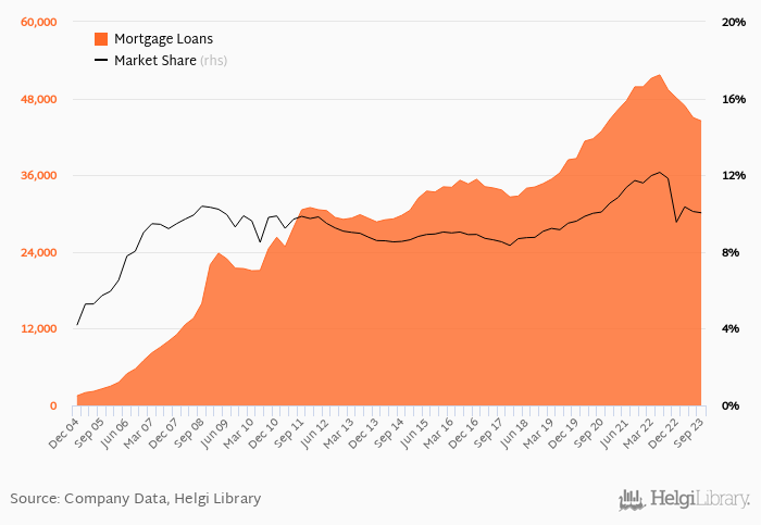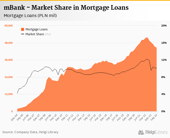 mBank accounted for 10.0% of all mortgage loans issued in Poland at the end of 3Q2023. Historically, the bank’s market share in mortgage loans reached an all time high of 12.1% in 2Q2022 and an all time low of 4.18% in 4Q2004.