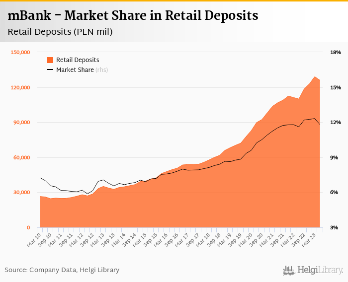 mBank accounted for 11.8% of all retail deposits taken by banks in Poland at the end of 2023-06-30. Historically, the bank’s market share in retail deposits reached an all time high of 12.3% in 2023-03-31 and an all time low of 5.87% in 2012-06-30.