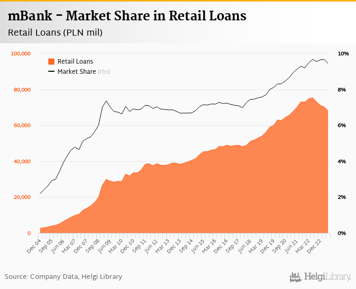 mBank accounted for 9.44% of all retail loans issued in Poland at the end of 2Q2023. Historically, the bank’s market share in retail loans reached an all time high of 9.67% in 2Q2022 and an all time low of 2.19% in 4Q2004.