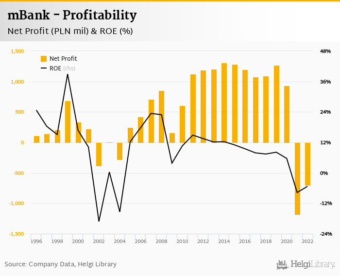 mBank made a net profit of PLN -703 mil in 2022, up 40.4% compared to the previous year. This implies a return on equity of -5.32%.