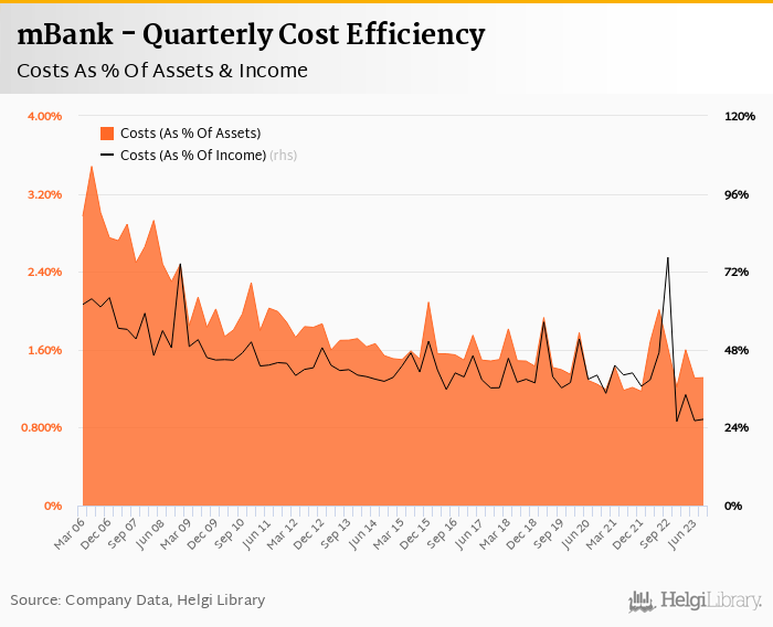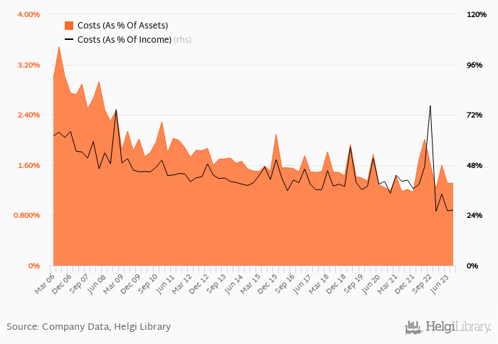 Historically, the bank’s costs reached an all time high of 76.5% of income in 3Q2022 and an all time low of 25.9% in 4Q2022.