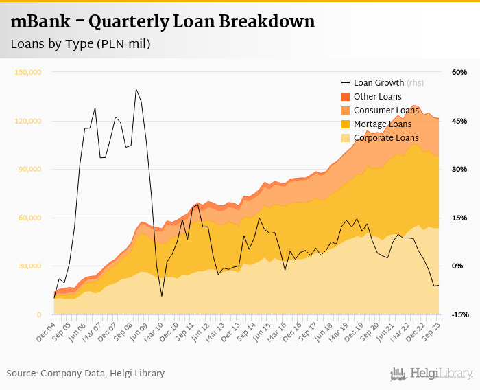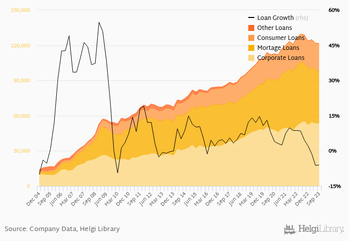 Mortgage loans represented 36.6% of the bank's loan book at the end of the year 3Q2023, consumer further 19.2% and corporate loans 44.0% of total loans.