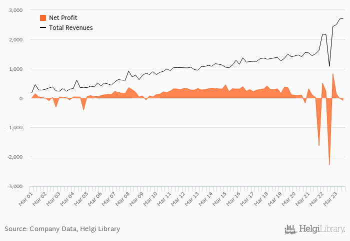Historically, the bank’s net profit reached an all time high of PLN 835 mil in 4Q2022 and an all time low of PLN -2,279 mil in 3Q2022. The average profit in the last six quarters amounted to PLN -195 mil.