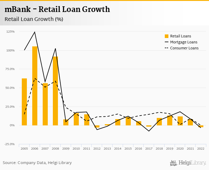mBank's retail loans reached PLN 71,122 mil at the end of 2022, down 2.40% compared to the previous year. In the last decade, the average annual loan growth amounted to 6.55%.
