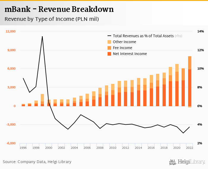 Comparing mBank with its closest peers, PKO BP generated total revenues of 3.99% of assets in 2022, Pekao operated with 3.83% revenue margin and ING Bank Slaski produced total income worth 3.54% of assets.
