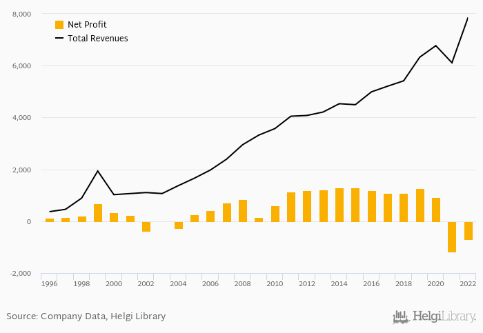 On the other hand, bank’s revenues amounted to an all time high of PLN 7,857 mil in 2022 and an all time low of PLN 366 mil in 1996. The average revenues in the last five years reached PLN 6,496 mil.
