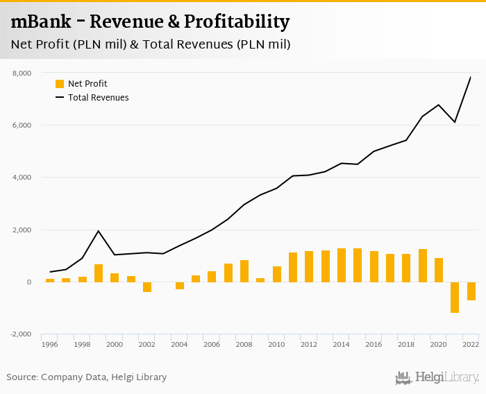 mBank made a net profit of PLN -703 mil under revenues of PLN 7,857 mil in 2022, up 40.4% and 28.6% respectively compared to the previous year.