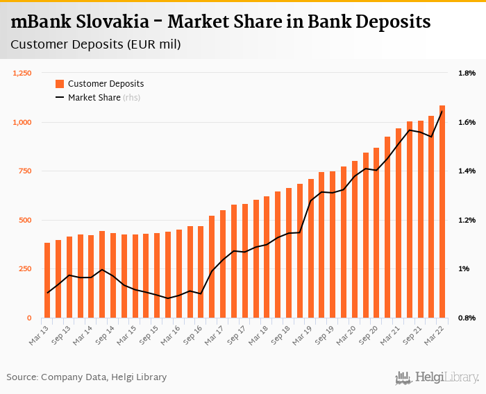 mBank Slovakia's customer deposits reached EUR 1,087 mil in 1Q2022, up 5.11% compared to the previous year.