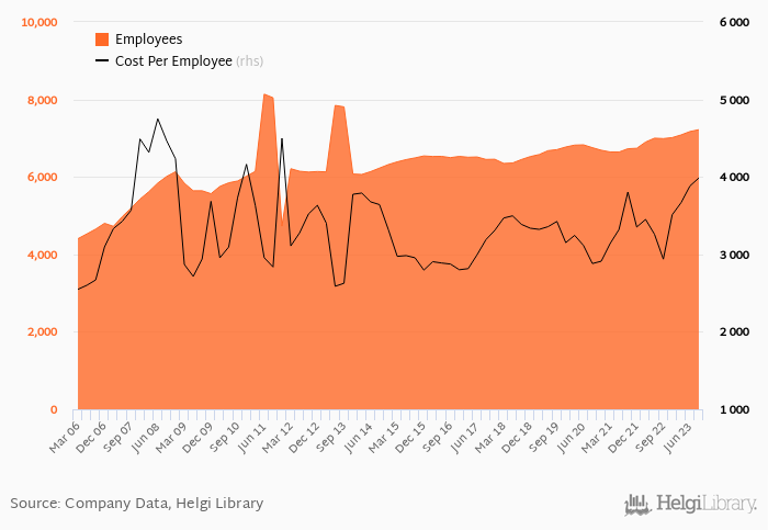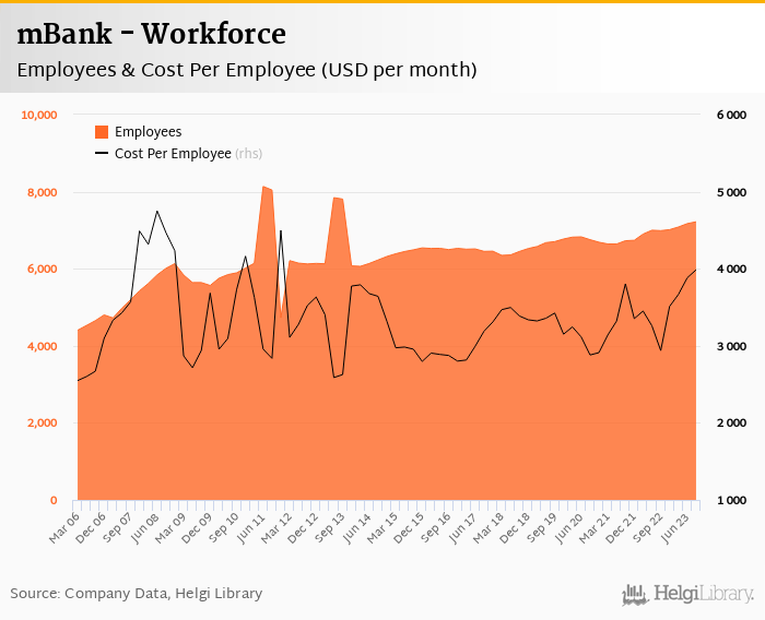 mBank employed 7,218 persons in 2023-09-30, up 0.664% when compared to the previous year. Historically, the bank's workforce hit an all time high of 8,136 persons in 2011-06-30 and an all time low of 4,404 in 2006-03-31.