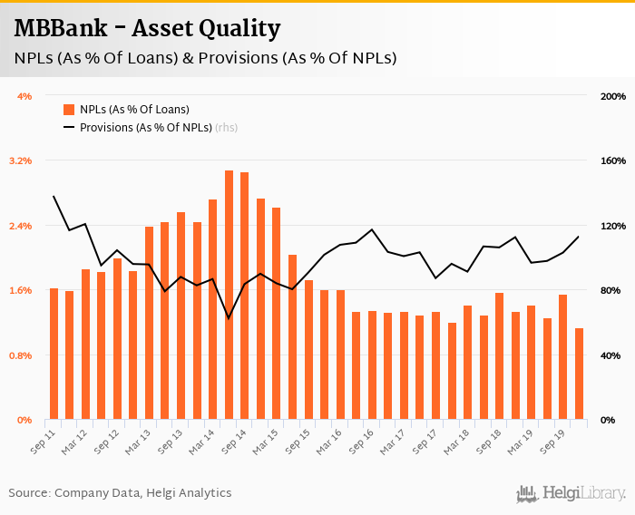 MBBank's non-performing loans reached 1.13% of total loans at the end of 2019-12-31, down from 1.33% compared to the previous year. Historically, the NPL ratio hit an all time high of 3.08% in 2014-06-30 and an all time low of 1.13% in 2019-12-31.