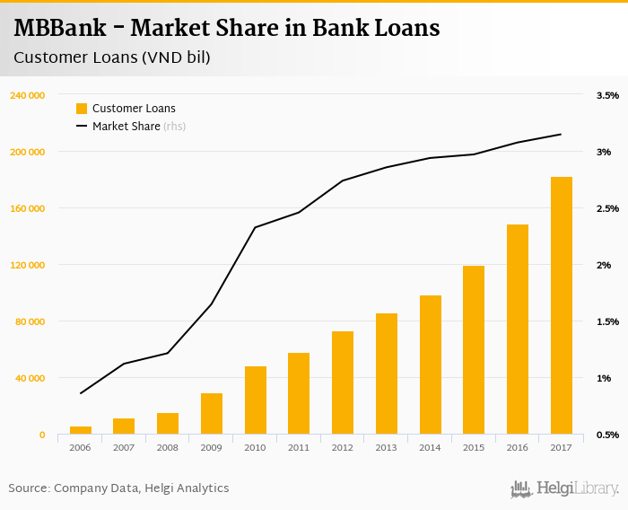 MBBank accounted for 3.15% of all customer loans issued in Vietnam at the end of 2017. Historically, the bank’s market share in customer loans reached an all time high of 3.15% in 2017 and an all time low of 0.854% in 2006.