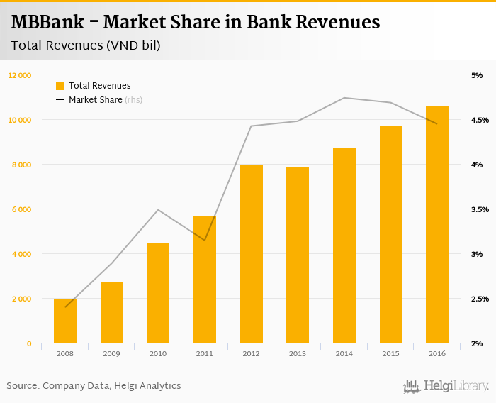 As a result, MBBank accounted for 4.45% of all bank revenues generated by banks in Vietnam in 2016. Historically, the bank’s market share in total revenues reached an all time high of 4.74% in 2014 and an all time low of 2.40% in 2008.