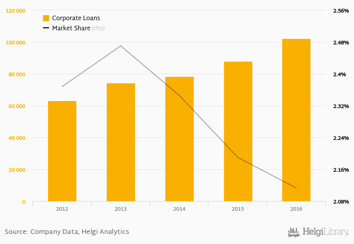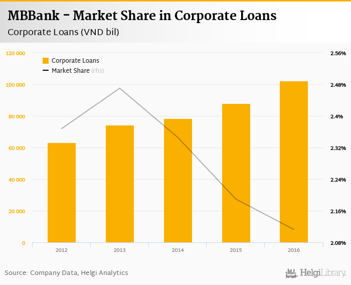 MBBank accounted for 2.11% of all corporate loans issued in Vietnam at the end of 2016. Historically, the bank’s market share in corporate loans reached an all time high of 2.47% in 2013 and an all time low of 2.11% in 2016.