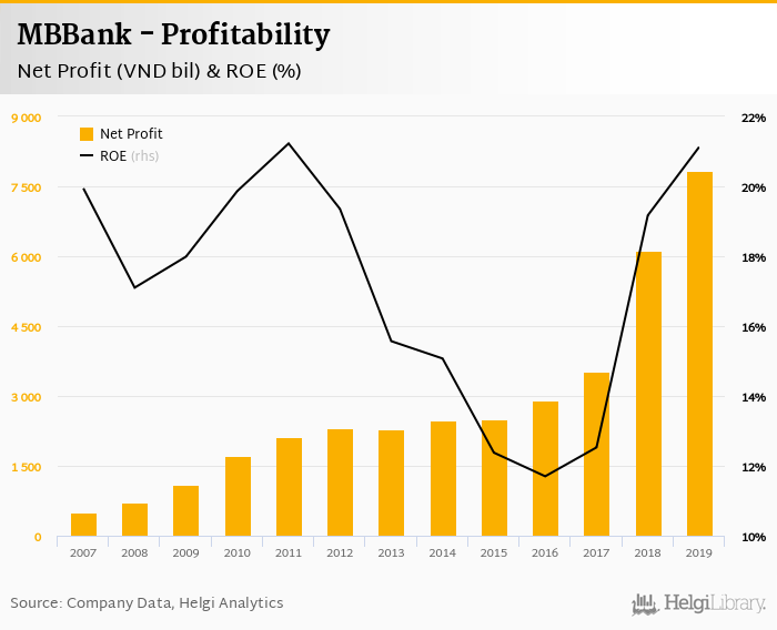 MBBank made a net profit of VND 7,823 bil in 2019, up 28.0% compared to the previous year. This implies a return on equity of 21.1%.