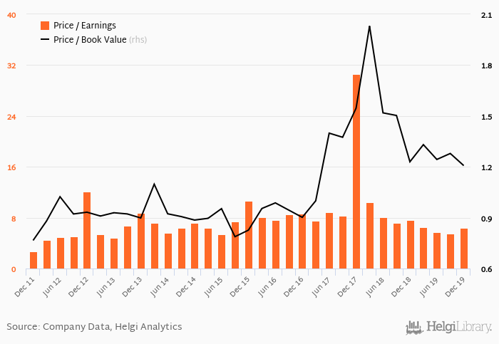 At the end of 4Q2019, the bank traded at price to earnings of 6.44x. Within the last five years, the multiple reached an all time high of 30.6x in 4Q2017 and an all time low of 5.41x in 2Q2015 with an average of 8.77x.