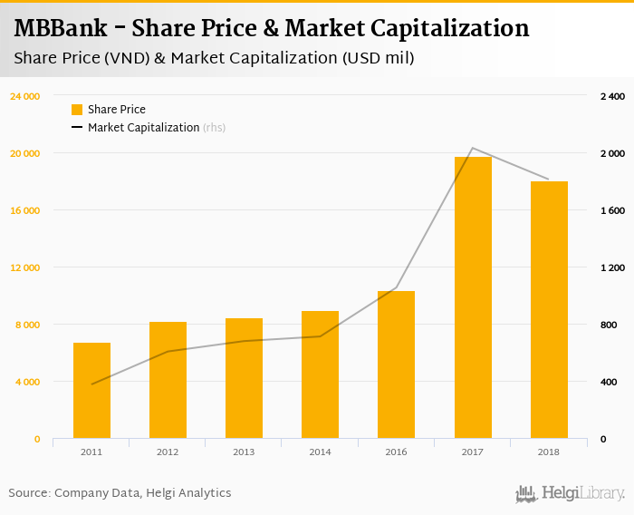 MBBank stock traded at VND 18,009 per share at the end of 2018 implying a market capitalization of USD 1,810 mil.
