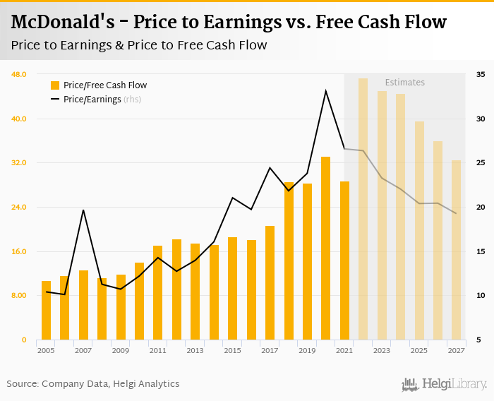 Regarding cash generated defined by the sum of net profit and depreciation, the stock traded at 22.1x at the end of 2021. When investments are excluded to get free cash flow, McDonald's traded at 28.7x.